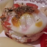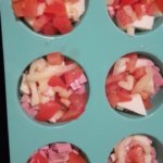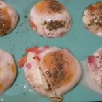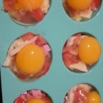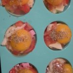 A muffinformába beledobáltam a gyorsan összevágott párizsit, erre került néhány kis sajtdarabka. Az egyik paradicsomot és paprikát összevágtam, ezt is rádobtam az eddigiekre, és tetejükre egy-egy tojást ütöttem, megszórtam kis oregánóval és sóval.