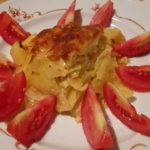 megpucoljuk a burgonyát majd hajszálvékonyra szeleteljük (ezt uborkagyalu segítségével könnyen megoldhatjuk ha nem akarjuk késsel karikázgatni vékonyra), összekeverjük a maradék pörkölttel (a húst előtte apróra vágjuk ha túl nagy darabok vannak benne) és néhány kanál kefírrel, ízlés szerint fűszerekkel ízesíthetjük. Aki szeretné, hogy laktatóbb legyen és jobban összeálljon, keverhet bele 1-2 tojást is. Egy tűzálló tálba borítjuk, lefedve az előmelegített sütőbe toljuk. Mikor már félig megpuhult a burgonya, reszelünk a tetejére egy kis sajtot, és fedő nélkül sütjük tovább, míg szépen megpirul a sajt. Úgy szeleteljük mintha tortát szeletelnénk. Friss paradicsommal vagy savanyúsággal találva nagyon finom.