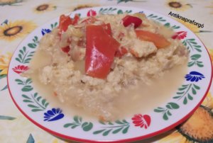 (Paradicsomot nem teszünk ebbe az ételbe! A fotón a saját készítésű töklecsó látható, én piros húsú paprikát is használtam, ezek piroslanak a fotón)