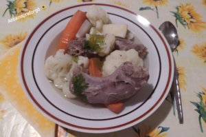 A libanyakat alaposan megmossuk. Hideg vizbe feltesszük főzni. Időnként leszedjük a tetejéről a habot. Mikor már minden habot eltávolítottunk, hozzáadjuk a megtisztított és feldarabolt sárgarépát, petrezselyemgyökeret, zellergumót, és a rózsáira szedett karfiolt. Sózzuk, borsozzuk. Lassan főzzük kis lángon, épp csak gyöngyözzön amíg készen lesz. Beletesszük a petrezselyemzöldet és a zellerzöldet mielőtt kész, még pár percig ezekkel főzzük.